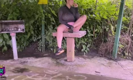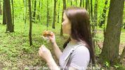 Парень настоящий кудесник, где-то достал чизбургер, а ведь все макдональдсы закрыты. Привлекательная подруга за такой подгон может и отдаться ему в лесу. Брюнетка сразу есть угощение, а потом опускается на корточки и принимается сосать член. Она сделала минет, после чего отдалась раком, отодвинув трусики в сторону.